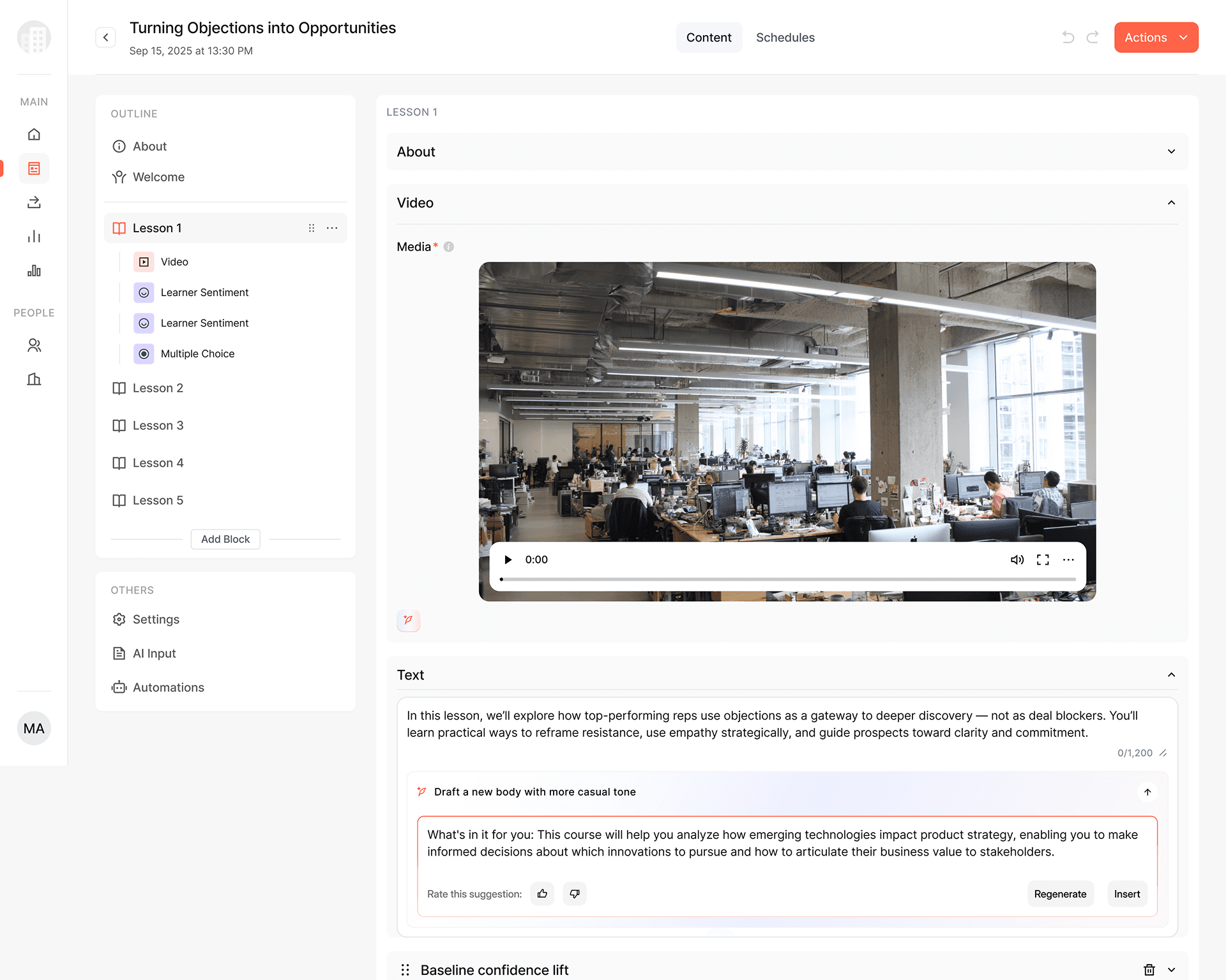 Arist creates everything: lessons, infographics, assessments, nudges, and comms. Add in podcasts and videos instantly. Translation, role-based personalization, verification, and governance are built-in.