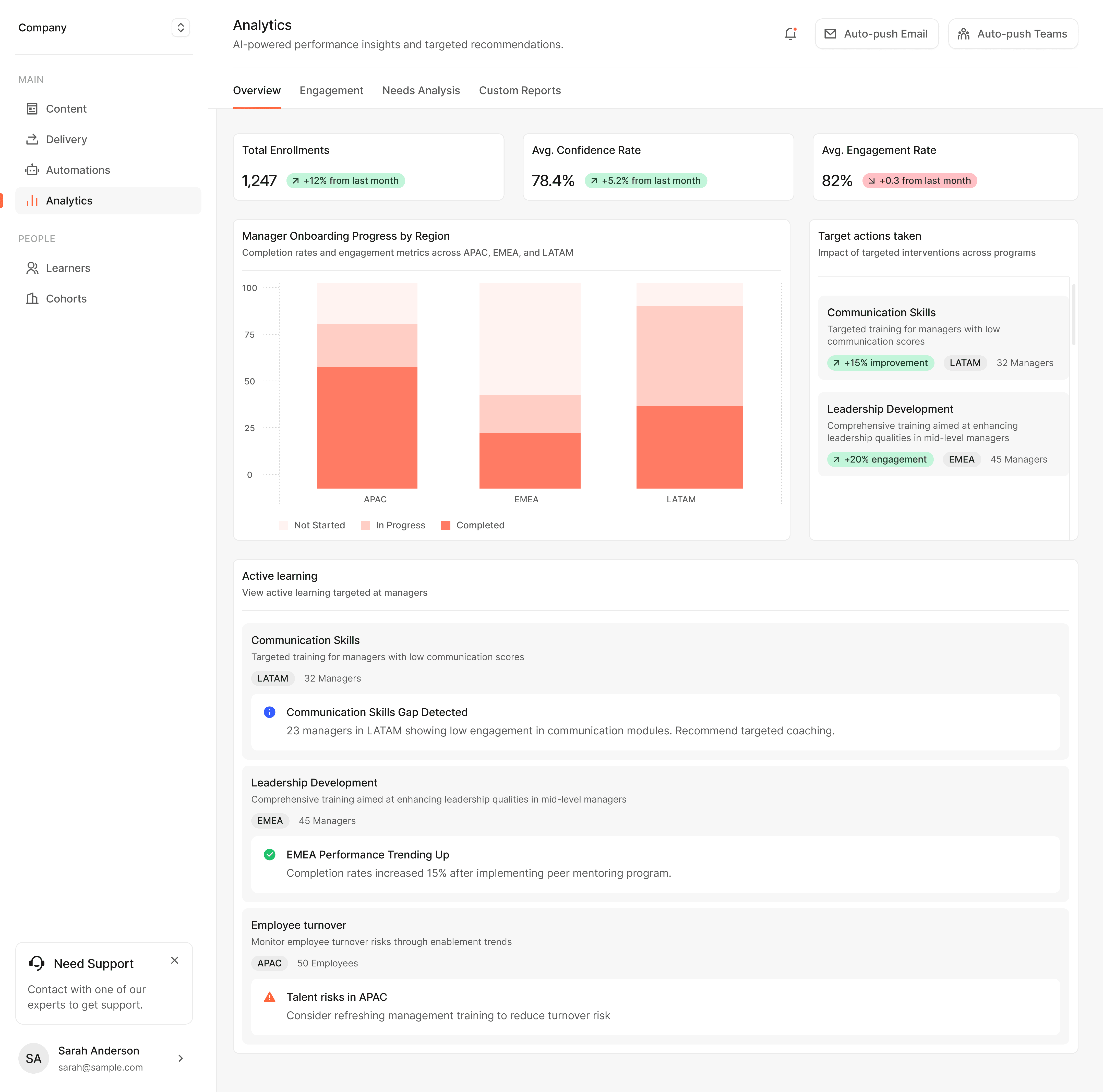 Monitor progress against identified skill gaps with real-time dashboards.