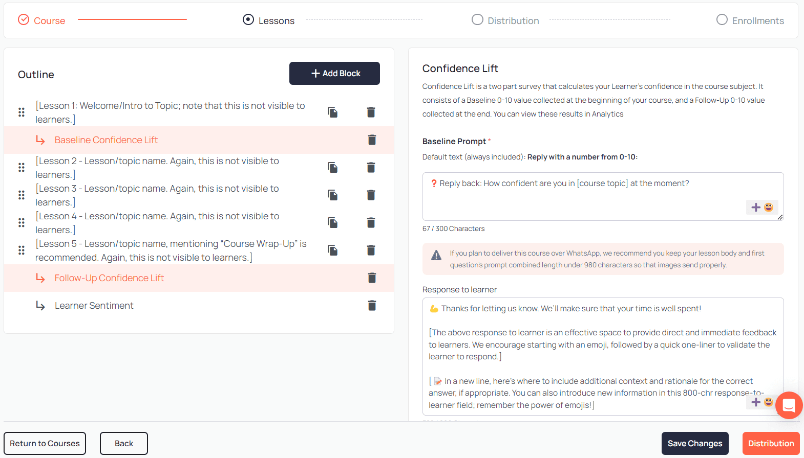 Settings controlled by admins help to mold how the learner interacts with nudges and learning moments. A variety of content “block types” provide differing behaviors ranging from polling to multiple choice, to before and after checks about confidence lift or the number of times an action is applied.