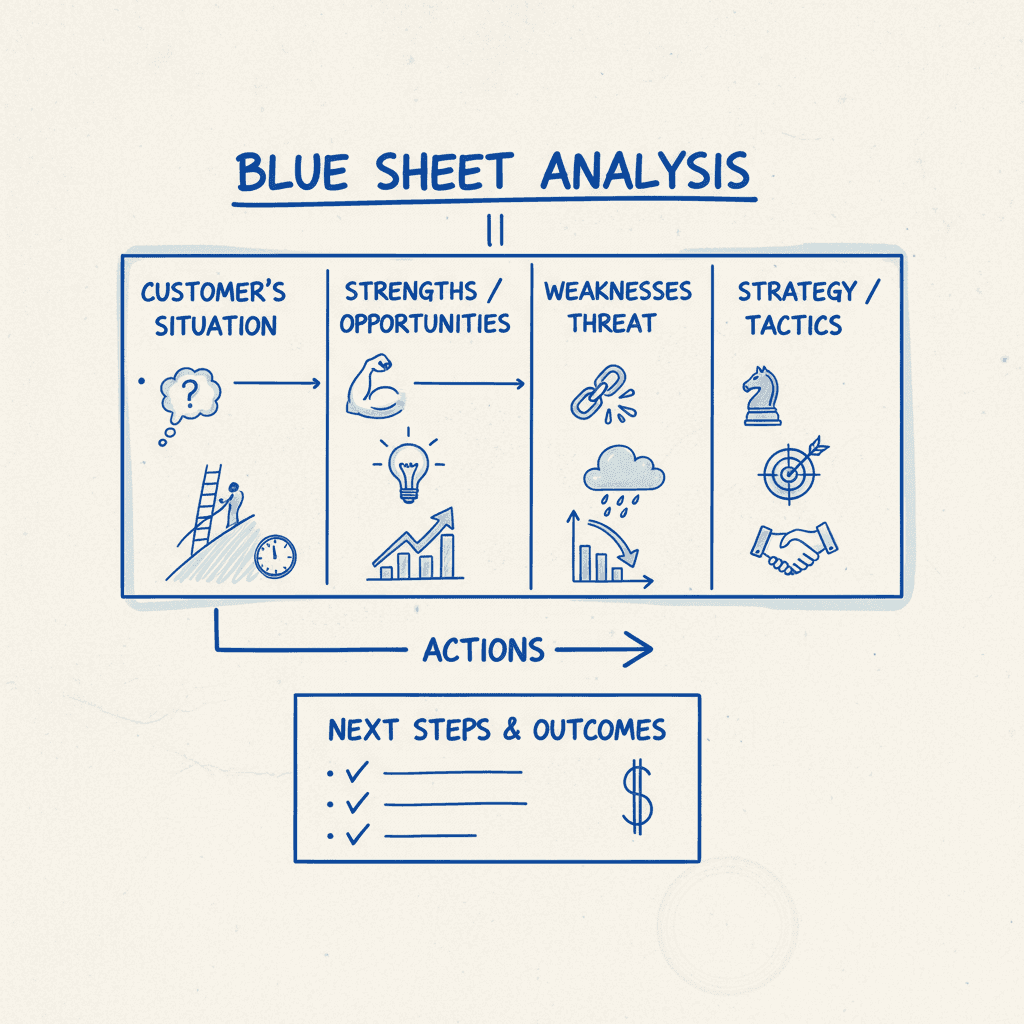 The Blue Sheet serves as your complete deal strategy document. It maps all buying influences, analyzes competitive positioning, identifies red flags, and defines win strategies for specific opportunities. Think of the Blue Sheet as your deal map while other documents handle tactical execution.