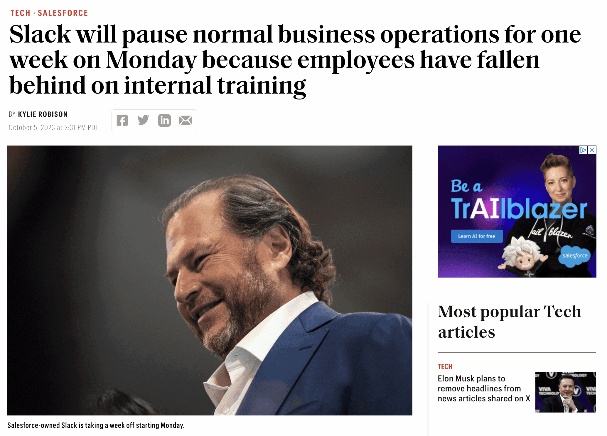 According to an inside Slack source, the move is seen by many as an "ego" move by Salesforce founder Mark Benioff, so he can brag that employees are using Trailhead.