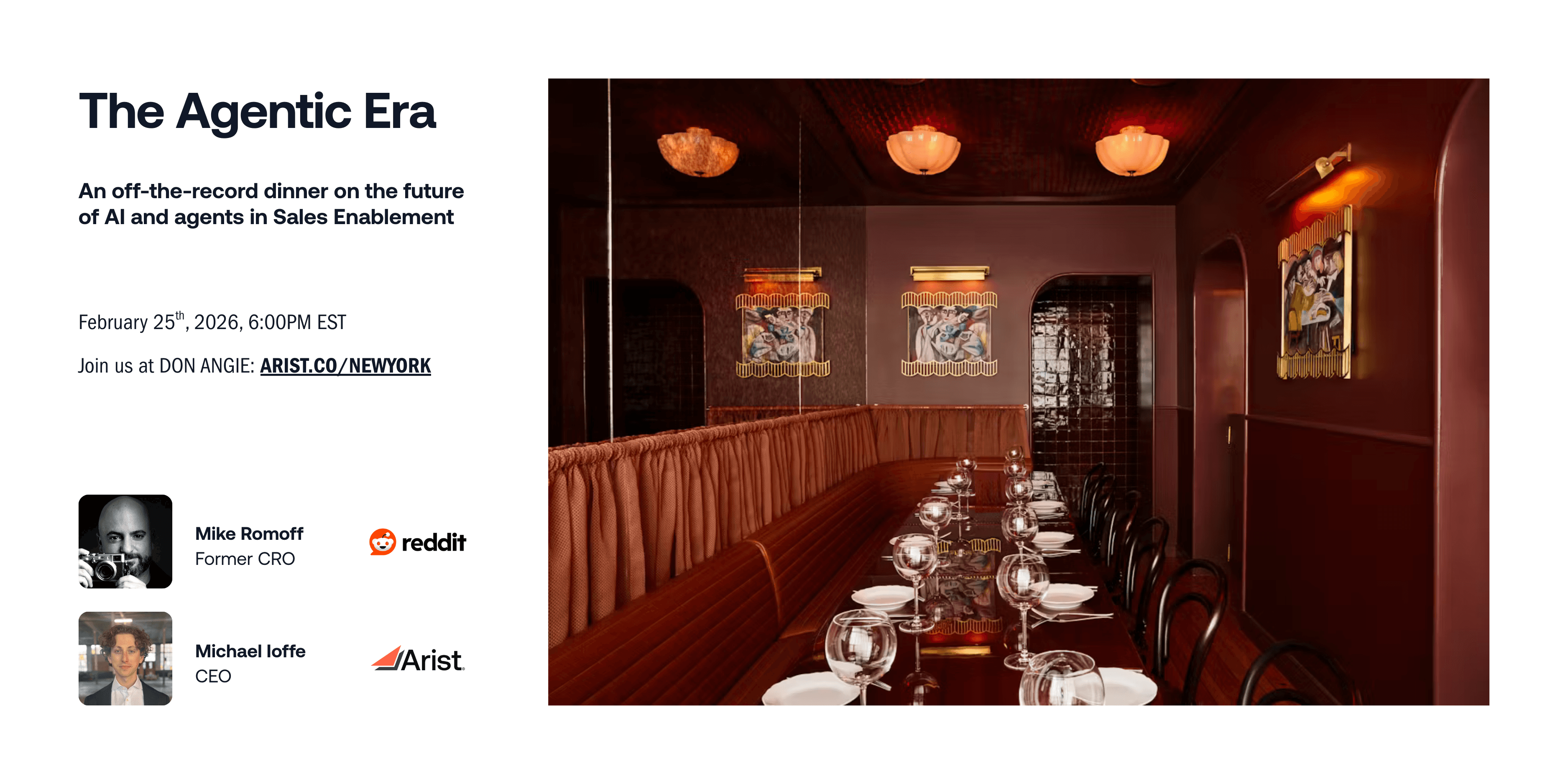 A private dinner at Don Angie with the former CRO at Reddit and CEO of Arist to discuss the future of AI and agents in Sales Enablement.