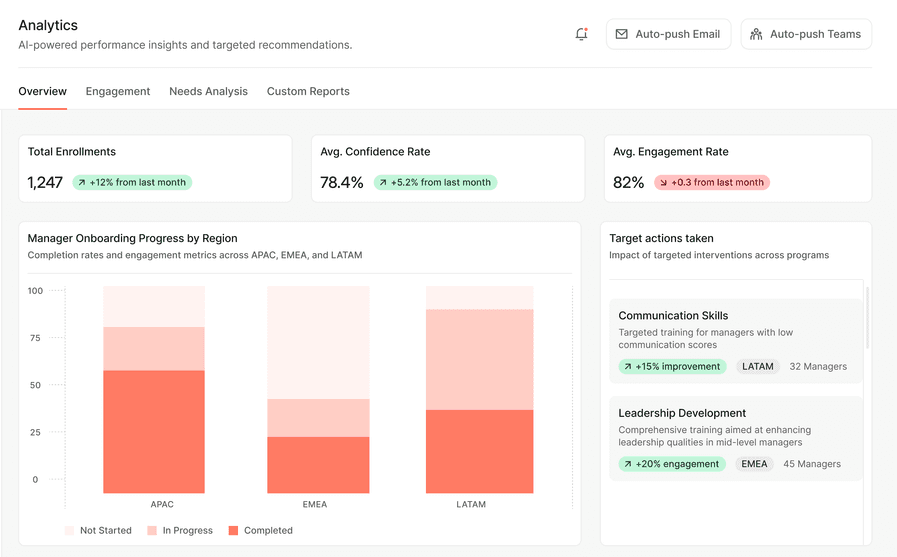 Instant enablement through Slack, Teams, SMS, and WhatsApp. One administrator deploys to thousands in minutes, achieving 95% completion through elimination of friction, not engagement tactics.